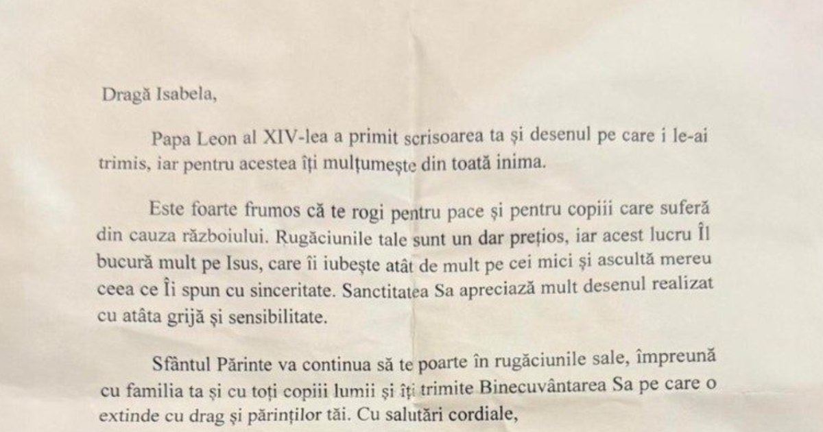 „Dragă Isabela”, se poate citi în scrisoarea de răspuns, „Papa Leon al XIV-lea a primit scrisoarea ta și desenul pe care i l-ai trimis, iar pentru acestea îți mulțumește din toată inima”.