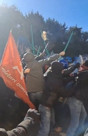 Manifestanții, conform ANSA, au folosit bombe fumigene și petarde, iar oamenii legii au răspuns cu tunuri cu apă. În urma confruntărilor, potrivit agenției de știri, patru polițiști au fost răniți.
