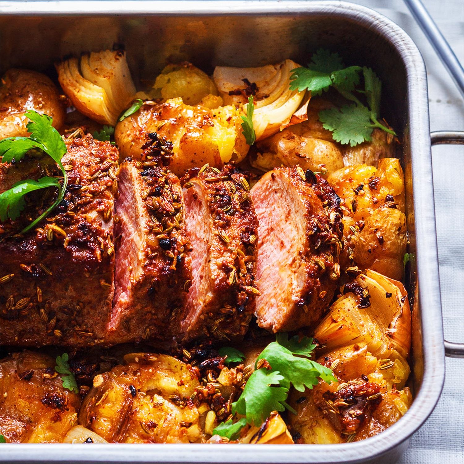 Ceapa se taie ceapa bucăți mari și se așază în tavă formând un pat. Ceapa va aromatiza carnea și va preveni arderea acesteia. Se scoate pulpa de porc din marinadă și se așază pe mijlocul tăvii. Cartofii se curăță, se spală și se taie în bucăți mari. Se adaugă pe lângă pulpă. Se condimentează pulpa de porc și cartofii cu sare, piper și oregano. Se stropește totul cu ulei și se adaugă o mare parte din marinadă.